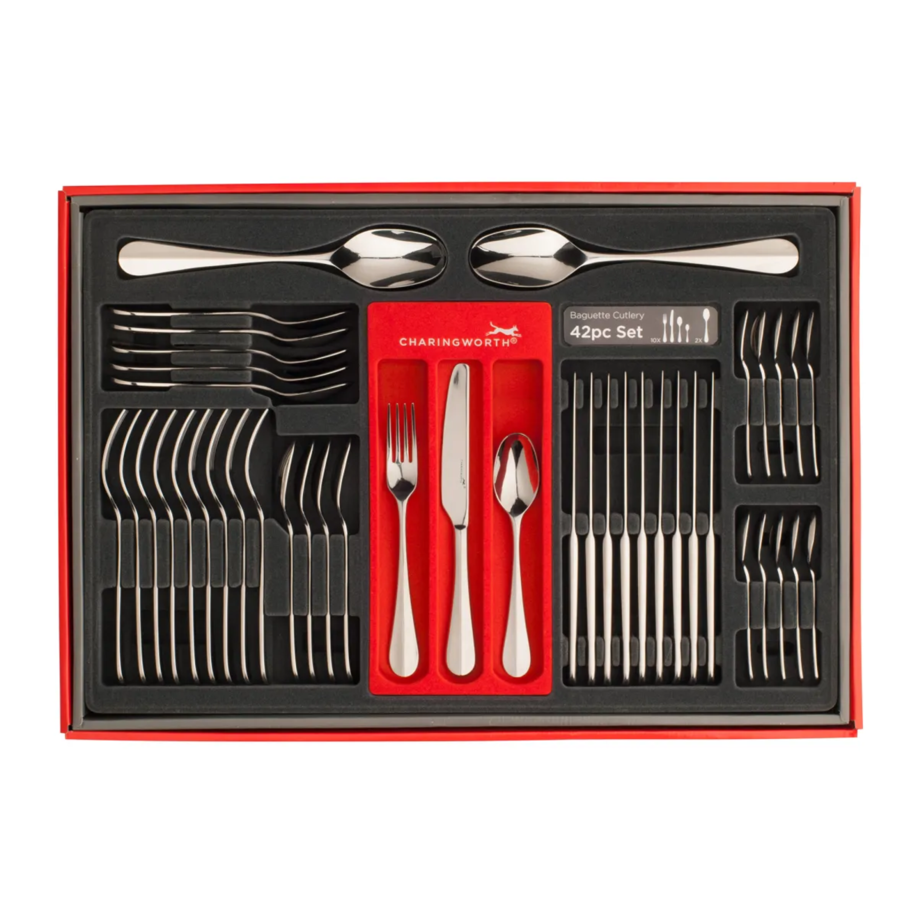 The Baguette mirror cutlery range has a classic, timeless style and an elegant form. It features soft, rounded edges, and a tapered ridge that runs along the full length of the handles. This classic cutlery range is ideal for everyday occasions and makes for a lovely addition to any home and dining table. Our Charingworth cutlery sets are packaged in lovely presentation boxes, making them perfect as gifts.